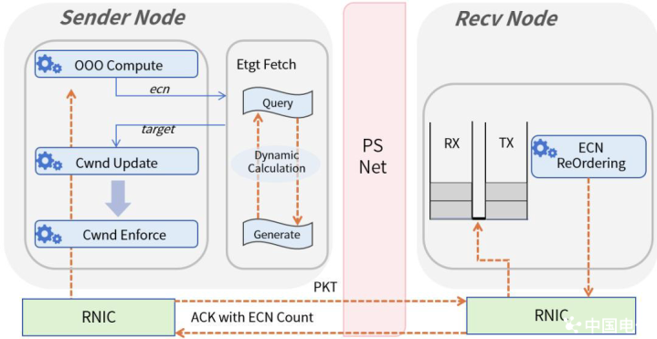(3)接收方则维护每个队列对(QP)上ECN标记数据包的统计信息,并将累积的ECN标记数量嵌入确认包中。
