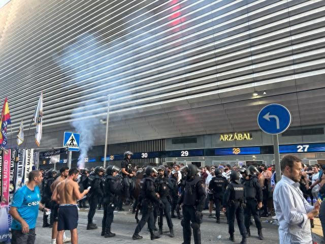 随着欧冠抽签和赛程尘埃落定,皇马赛季欧冠首战坐阵伯纳乌迎战马赛的比赛便被马德里警方列入“高风险活动”行列,马赛极端球迷组织臭名昭著,放眼全欧洲都是最难管束的球迷群体之一,法甲赛场上就曾多次惹出事端导致比赛被迫中断。到了新赛季欧冠首战当天,数千马赛极端球迷涌入马德里,无疑让警方如临大敌,根据报道,警方派出接近2000名警力部署在伯纳乌周围和全市的主要地标附近,以防止马赛球迷闹事。比赛当天中午,市中心巡逻的警卫人员就随处可见,不少身穿马赛球衣的球迷成群结队走过马德里街巷,并放声唱响助威歌曲。